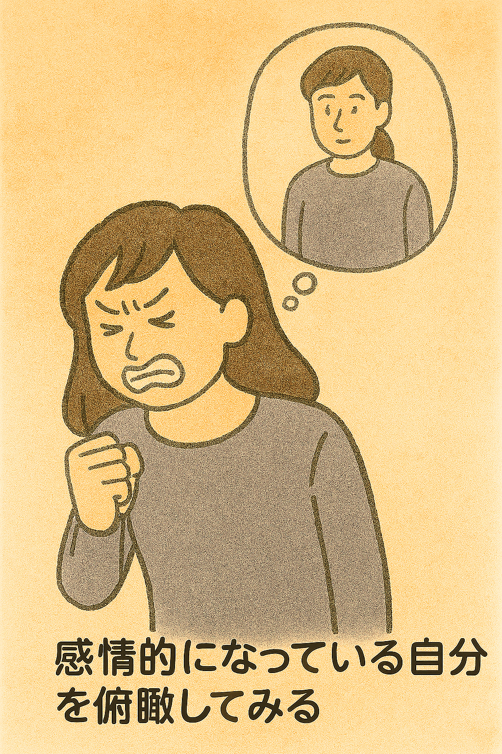 もう一人の自分が出てきて感情的になっている自分を俯瞰してみているイメージといえば分かりやすいかもしれません。